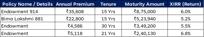 To put this into perspective we have analyzed 2 LIC policies which our clients had from early 2000’s and 2 new policies which are currently being sold. The analysis reveals a stark financial reality: none of them deliver returns that beat inflation.